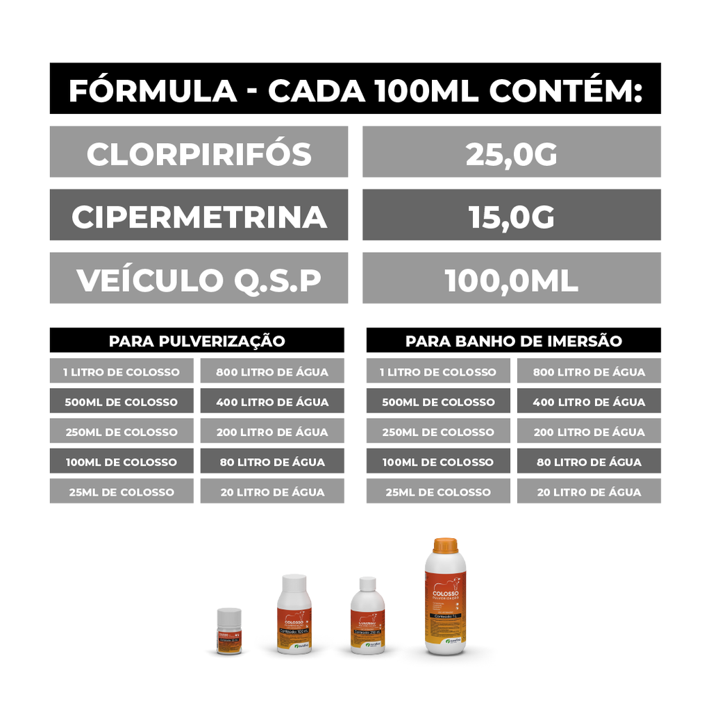 Adicionar essa primeira solução obtida ao tanque ou banheiro de imersão, parcialmente preenchido por água limpa e homogeneizar vigorosamente para obter uma solução final homogênea e de acordo com a diluição indicada. Não adicionar nenhum tipo de estabilizante. Os animais devem passar pelo banheiro de maneira individual, de modo que todo o corpo fique em pleno contato com a calda. O tanque ou banheiro de imersão deve estar limpo e livre de resíduos. Sempre que a solução permanecer parada, homogeneizar novamente. Realizar as recargas mediante análise da calda. Em estudo conduzido com o COLOSSO PULVERIZAÇÃO verificou-se que as concentrações dos ativos variam em função do nível de calda do banheiro de imersão e durante 12 meses foram necessárias 3 (três) recargas na proporção de 1:800, que foram realizadas em função da redução de no mínimo 10% do volume da calda.
